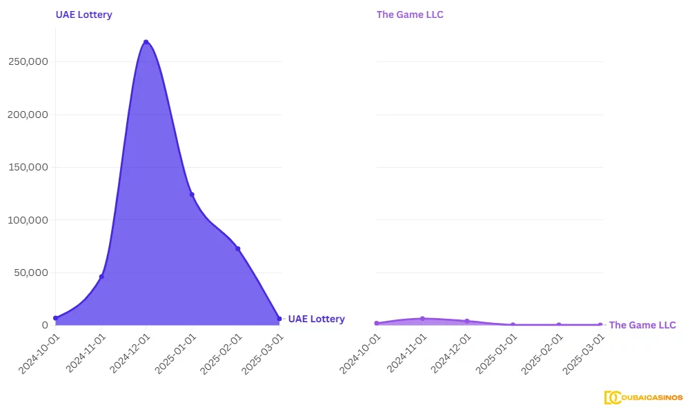 Search interest in GCGRA dropped by approximately 58.5% over the year, but there’s a clear correlation—the focus shifted to the UAE Lottery when The Game LLC secured the first gaming license in the UAE.